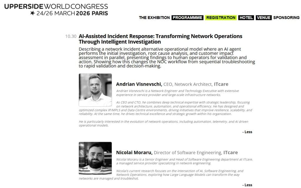 LIVE SESSION BY ITCARE SPEAKERSUPPERSIDE WORLD CONGRESS PARIS 2026 We are pleased to announce that ITcare will be speaking on the main stage at Upperside World Congress Paris 2026. Andrian Visnevschi and Nicolai Moraru will deliver a presentation titled: “AI Assisted Incident Response. Transforming Network Operations Through Intelligent Investigation.” The talk highlights […]